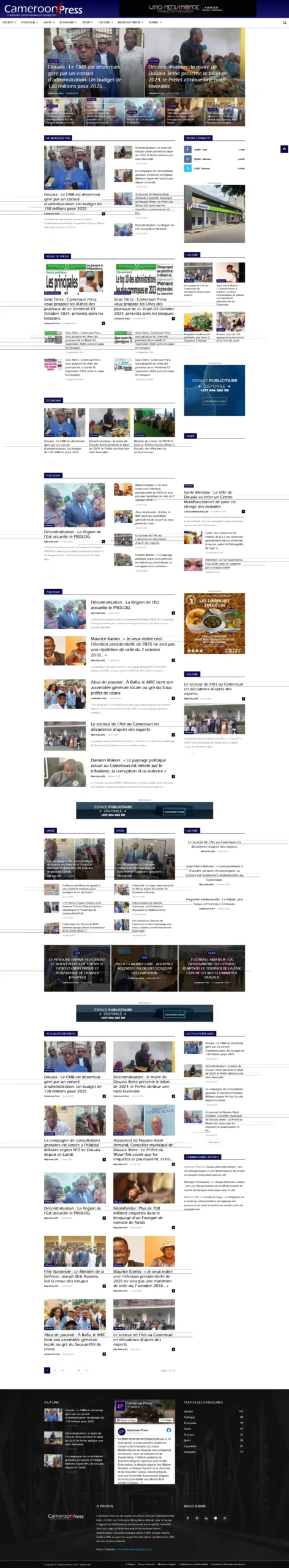 Cameroon Press est un organe de presse créé par le journaliste Billy Kolla, et édité par l’entreprise Wing Media Monde, basé à Libreville. L’objectif est d’informer les camerounais sur ce qui fait l’actualité dans leur pays, et de promouvoir le Journalisme libre et indépendant. L’actualité politique prime à 40%, ensuite vient la Santé à 30%. Le sport, le social et les faits divers constituent les 30% de son contenu éditorial.